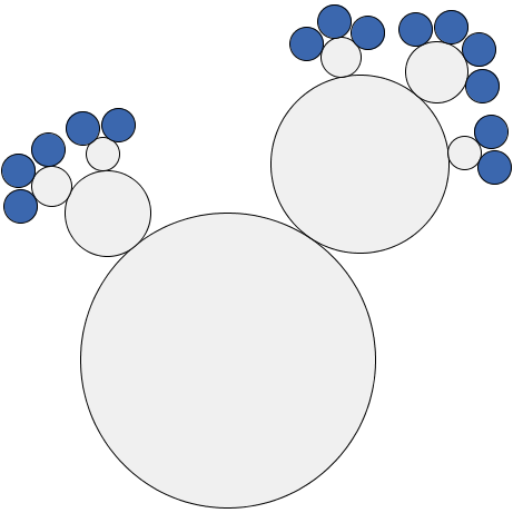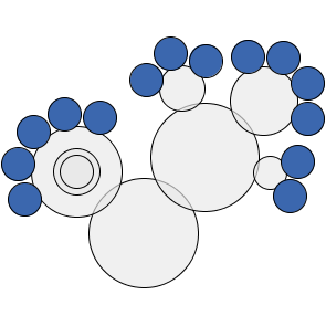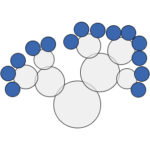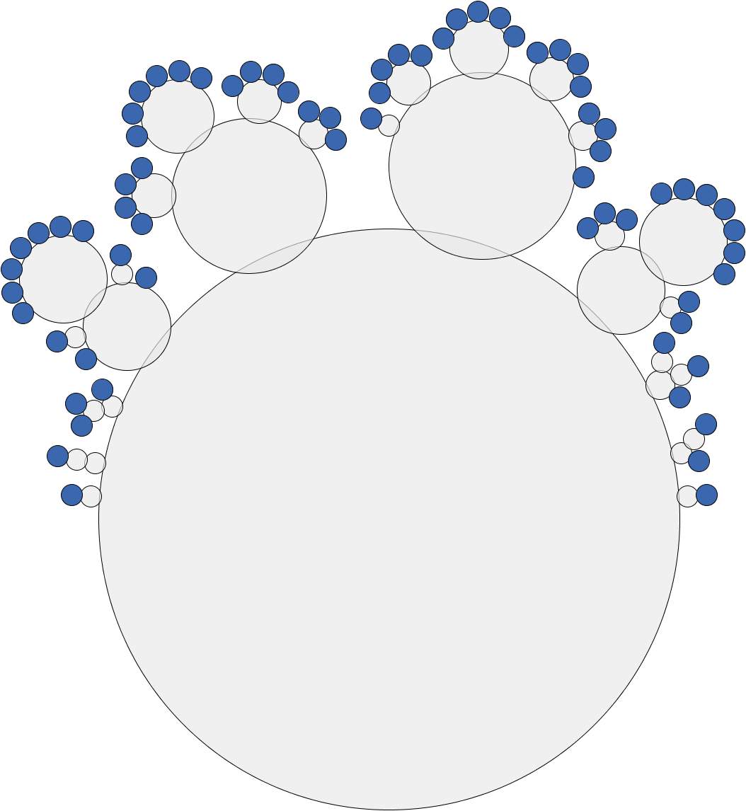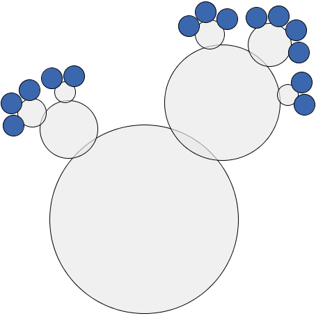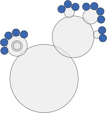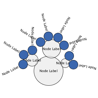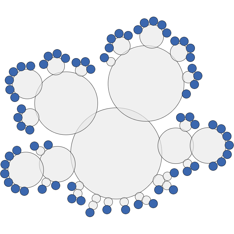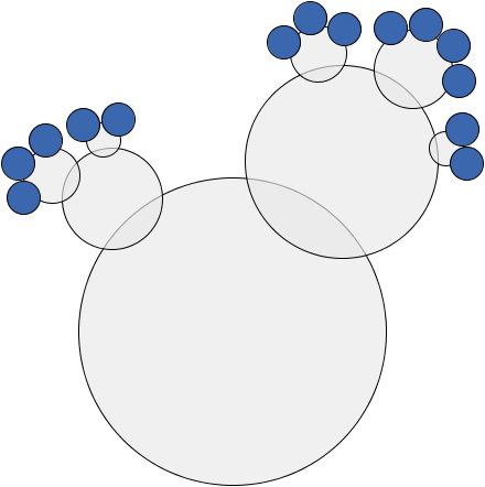 Generally, the cactus group layout algorithm places all child nodes in the hierarchy such that they are touching their respective parent node. However, an overlap can be specified as a fraction of the child's radius, by which the node will be moved towards the parent node's center.