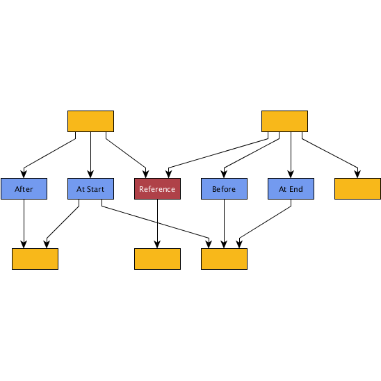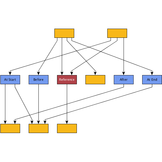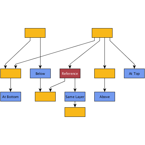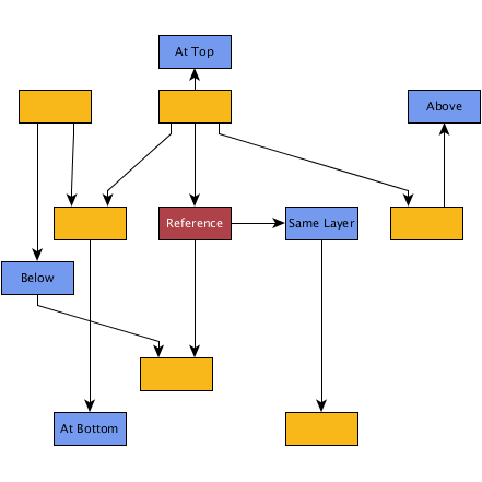 LayerConstraintFactory instance![]() A graph laid out with IncrementalHierarchicLayouter with default settings. The labels indicate the desired placement of certain nodes relative to a reference node. | ![]() After defining appropriate layer constraints and running the layout again, the labeled nodes now have their intended placement. |