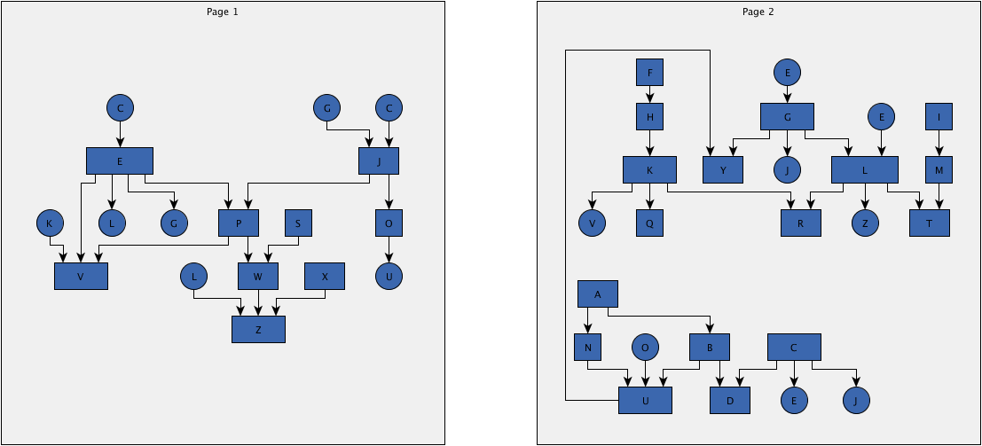 Circular nodes denote the so-called connectors that split edges to nodes placed on other pages.