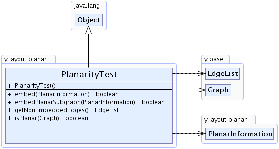 planarity (isPlanar(Graph), to create a planar embedding of a planar graph (embed(PlanarInformation)) or to