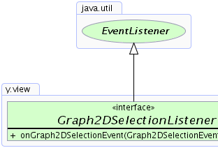 The listener interface for receiving Graph2DSelectionEvents. The class that is interested in processing a selection event implements this interface. The object created with that class is then registered with a Graph2D. When the selection state of a node or an edge within the graph changes, the listener object's selectionStateChanged method is invoked.