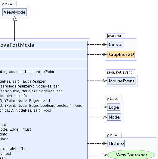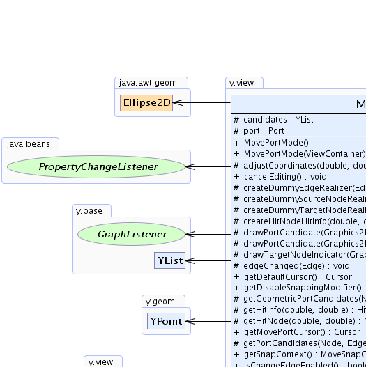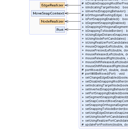 A Port of a selected edge can be moved to another position by pressing the left mouse button on it and then dragging the port around. While dragging port candidate boxes will appear. These boxes mark the positions that are available for the port. The set of available port positions depends on the return value of the node realizer methodNodeRealizer.getPortCandidates(double).